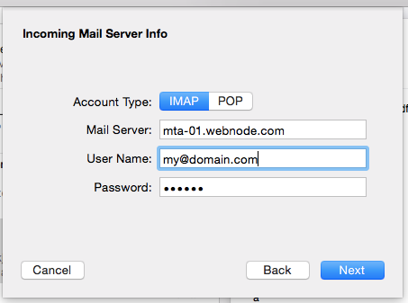 3. In the Incoming Mail Server set to: mta-01.webnode.com, use the email address as User Name.