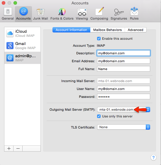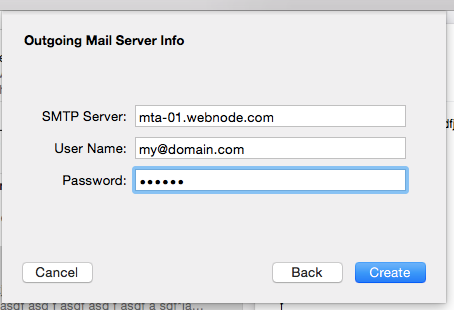 4. In the Outgoing Mail Server set to: mta-01.webnode.com and fill in the User Name and Password.